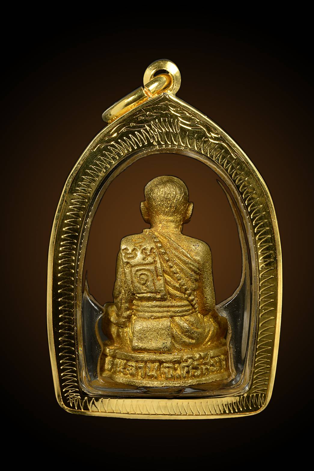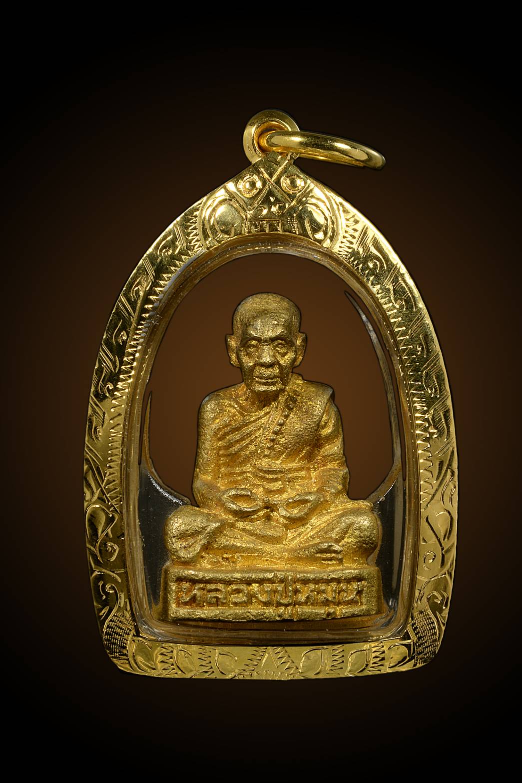 รูปหล่อ รวยทันใจ หลวงปู่หมุน วัดบ้านจาน เนื้อทองทิพย์ พิมพ์เล็ก เลี่ยมทอง มีกล่องเดิมจากวัด