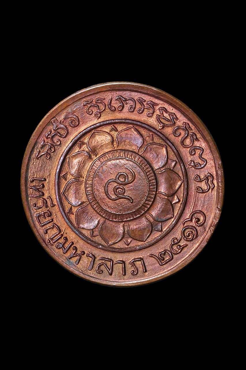 ด้านหลังเหรียญ ตรงกลางเป็นรูปดอกบัวบาน มีเลข “๕” อยู่ตรงกลางเหรียญ ด้านบนมีอักขระขอม 10 ตัว ด้านล่างเขียนว่า “เหรียญมหาลาภ ๒๕๑๖”